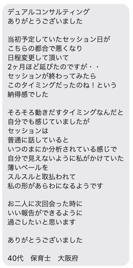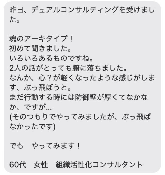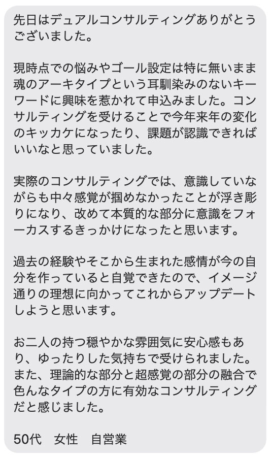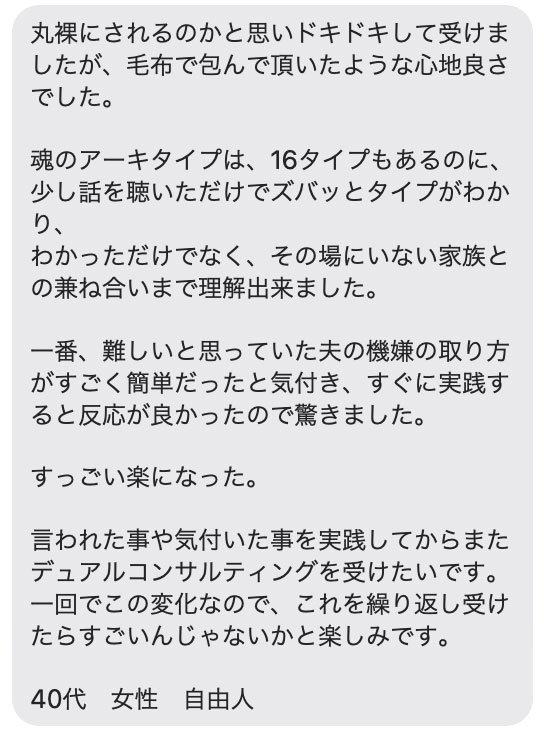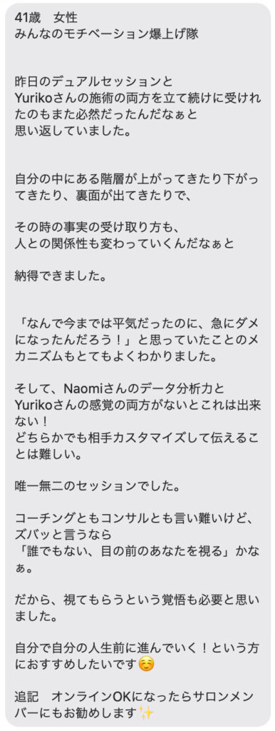その診断を元に、そのパターンではない2割の重要なあなた個別の要素を、Yurikoさんがすくい上げて言葉にし、あなたに浸透させてゆきます。