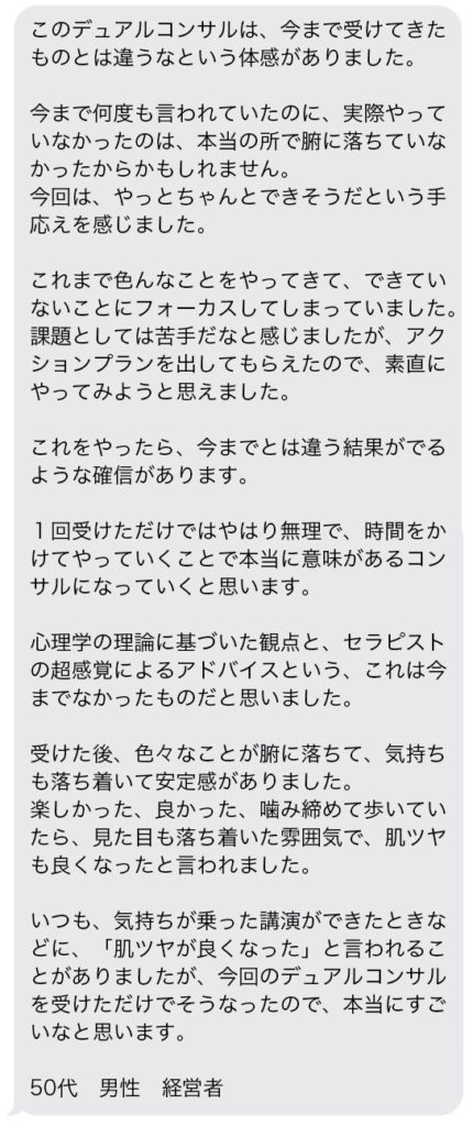それが、Yurikoさんと私がタッグを組むことで実現する『デュアルコンサルティング』なんです。